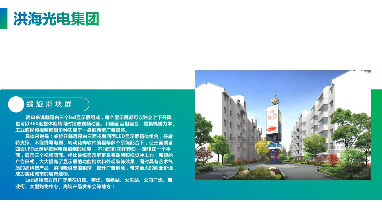 具體來說是:螺旋升降屏是由三面或者四面LED顯示屏箱體組合,在旋轉支撐、不繞線導電刷、轉動花樣軟件編程等多個系統(tǒng)配合下,使三面或者四面LED顯示屏按照電腦編制的程序---不同時間花樣轉動---定格在一個平面,展示三個視頻畫面。相比傳統(tǒng)顯示屏更具有動感和視覺沖擊力,新穎的廣告形式,大大提高了顯示屏的功能檔次和外觀裝飾效果,同時具有藝術氣質的高科技產品,瞬間吸引您的眼球,提升廣告創(chuàng)意,帶來更大的商業(yè)價值,成為美化城市的城市地標。Led旋轉魔方屏廣泛用在機場、商場、高鐵站、火車站、公園廣場、商業(yè)街、大型購物中心、高端產品發(fā)布會等地方。